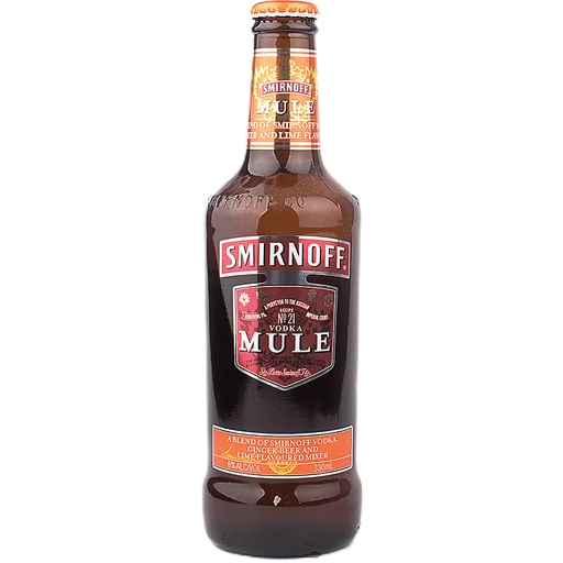 Smirnoff Mule is a refreshing ready-to-drink cocktail inspired by the classic Moscow Mule. Crafted with Smirnoff Vodka, ginger beer, and a splash of lime, it delivers a perfect balance of zesty citrus and spicy ginger flavor. Smooth, crisp, and lightly carbonated, it offers a satisfying kick with every sip. At 6% alcohol by volume (ABV), Smirnoff Mule is an easy-drinking yet flavorful cocktail that’s ideal for parties, chill nights, or any occasion that calls for something cool and vibrant. Best enjoyed straight from the bottle or poured over ice with a slice of lime.